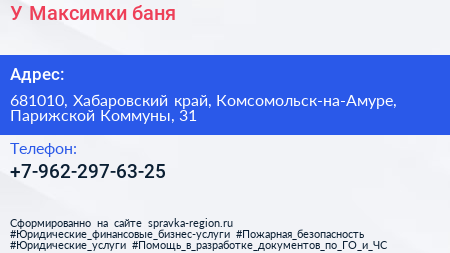 У Максимки, баня по адресу 681010, Хабаровский край, Комсомольск-на-Амуре, Парижской Коммуны, 31 в дальнейшем Организация, размещена в следующих категориях: