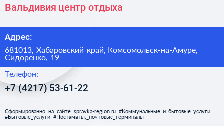 Вальдивия, центр отдыха по адресу 681013, Хабаровский край, Комсомольск-на-Амуре, Сидоренко, 19 в дальнейшем Организация, размещена в следующих категориях: