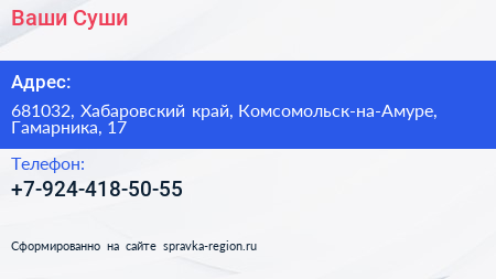 Ваши Суши по адресу 681032, Хабаровский край, Комсомольск-на-Амуре, Гамарника, 17 в дальнейшем Организация, размещена в следующих категориях:
