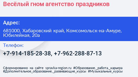 Весёлый гном, агентство праздников по адресу 681000, Хабаровский край, Комсомольск-на-Амуре, Юбилейная, 20а в дальнейшем Организация, размещена в следующих категориях: