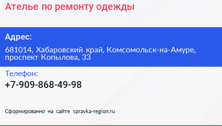 Ателье по ремонту одежды по адресу 681014, Хабаровский край, Комсомольск-на-Амуре, проспект Копылова, 33 в дальнейшем Организация, размещена в следующих категориях:
