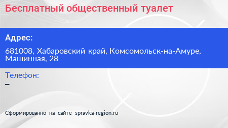 Бесплатный общественный туалет по адресу 681008, Хабаровский край, Комсомольск-на-Амуре, Машинная, 28 в дальнейшем Организация, размещена в следующих категориях: