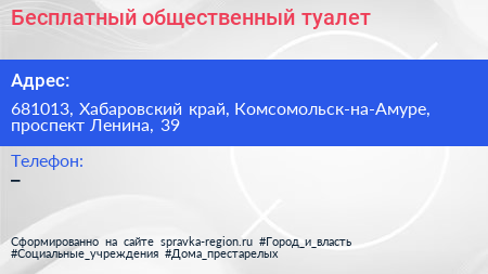Бесплатный общественный туалет по адресу 681013, Хабаровский край, Комсомольск-на-Амуре, проспект Ленина, 39 в дальнейшем Организация, размещена в следующих категориях: