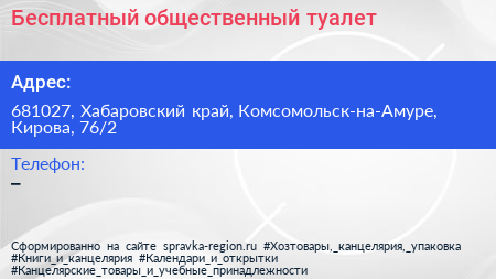 Бесплатный общественный туалет по адресу 681027, Хабаровский край, Комсомольск-на-Амуре, Кирова, 76/2 в дальнейшем Организация, размещена в следующих категориях: