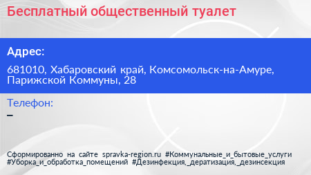 Бесплатный общественный туалет по адресу 681010, Хабаровский край, Комсомольск-на-Амуре, Парижской Коммуны, 28 в дальнейшем Организация, размещена в следующих категориях: