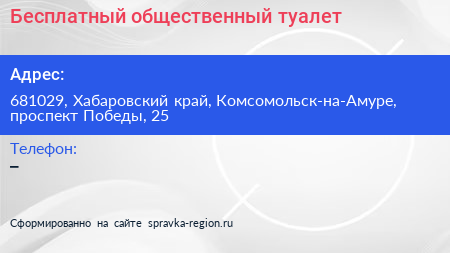 Бесплатный общественный туалет по адресу 681029, Хабаровский край, Комсомольск-на-Амуре, проспект Победы, 25 в дальнейшем Организация, размещена в следующих категориях: