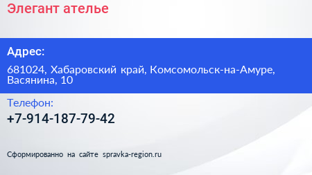 Элегант, ателье по адресу 681024, Хабаровский край, Комсомольск-на-Амуре, Васянина, 10 в дальнейшем Организация, размещена в следующих категориях: