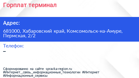 Горплат, терминал по адресу 681000, Хабаровский край, Комсомольск-на-Амуре, Пермская, 2/2 в дальнейшем Организация, размещена в следующих категориях: