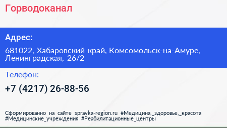 Горводоканал по адресу 681022, Хабаровский край, Комсомольск-на-Амуре, Ленинградская, 26/2 в дальнейшем Организация, размещена в следующих категориях: