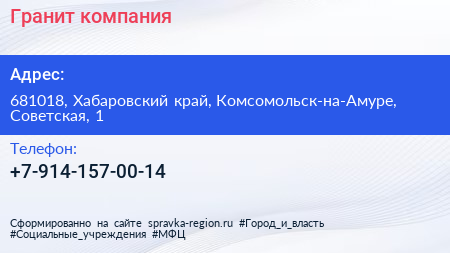 Гранит, компания по адресу 681018, Хабаровский край, Комсомольск-на-Амуре, Советская, 1 в дальнейшем Организация, размещена в следующих категориях: