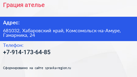 Грация, ателье по адресу 681032, Хабаровский край, Комсомольск-на-Амуре, Гамарника, 24 в дальнейшем Организация, размещена в следующих категориях: