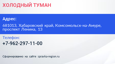 ХОЛОДНЫЙ ТУМАН по адресу 681013, Хабаровский край, Комсомольск-на-Амуре, проспект Ленина, 13 в дальнейшем Организация, размещена в следующих категориях: