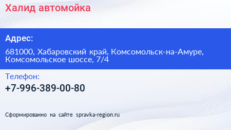 Халид, автомойка по адресу 681000, Хабаровский край, Комсомольск-на-Амуре, Комсомольское шоссе, 7/4 в дальнейшем Организация, размещена в следующих категориях: