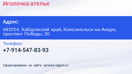 Иголочка, ателье по адресу 681014, Хабаровский край, Комсомольск-на-Амуре, проспект Победы, 20 в дальнейшем Организация, размещена в следующих категориях: