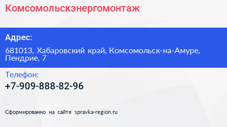 Комсомольскэнергомонтаж по адресу 681013, Хабаровский край, Комсомольск-на-Амуре, Пендрие, 7 в дальнейшем Организация, размещена в следующих категориях: