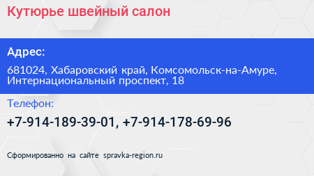 Кутюрье, швейный салон по адресу 681024, Хабаровский край, Комсомольск-на-Амуре, Интернациональный проспект, 18 в дальнейшем Организация, размещена в следующих категориях: