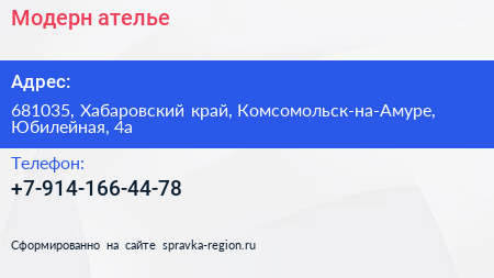 Модерн, ателье по адресу 681035, Хабаровский край, Комсомольск-на-Амуре, Юбилейная, 4а в дальнейшем Организация, размещена в следующих категориях: