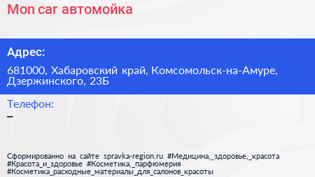 Mon car, автомойка по адресу 681000, Хабаровский край, Комсомольск-на-Амуре, Дзержинского, 23Б в дальнейшем Организация, размещена в следующих категориях: