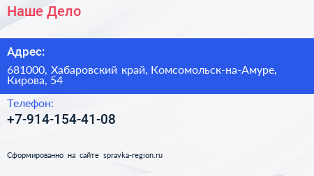 Наше Дело по адресу 681000, Хабаровский край, Комсомольск-на-Амуре, Кирова, 54 в дальнейшем Организация, размещена в следующих категориях: