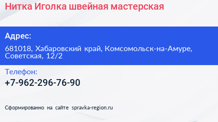 Нитка & Иголка, швейная мастерская по адресу 681018, Хабаровский край, Комсомольск-на-Амуре, Советская, 12/2 в дальнейшем Организация, размещена в следующих категориях: