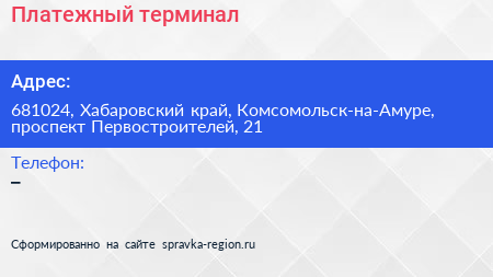 Платежный терминал по адресу 681024, Хабаровский край, Комсомольск-на-Амуре, проспект Первостроителей, 21 в дальнейшем Организация, размещена в следующих категориях: