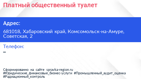 Платный общественный туалет по адресу 681018, Хабаровский край, Комсомольск-на-Амуре, Советская, 2 в дальнейшем Организация, размещена в следующих категориях: