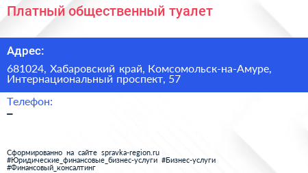 Платный общественный туалет по адресу 681024, Хабаровский край, Комсомольск-на-Амуре, Интернациональный проспект, 57 в дальнейшем Организация, размещена в следующих категориях: