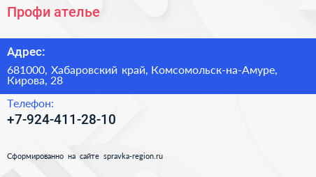 Профи, ателье по адресу 681000, Хабаровский край, Комсомольск-на-Амуре, Кирова, 28 в дальнейшем Организация, размещена в следующих категориях: