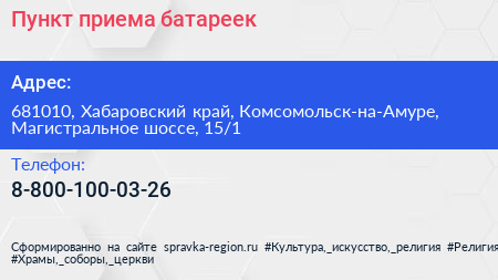Пункт приема батареек по адресу 681010, Хабаровский край, Комсомольск-на-Амуре, Магистральное шоссе, 15/1 в дальнейшем Организация, размещена в следующих категориях: