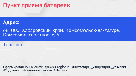 Пункт приема батареек по адресу 681000, Хабаровский край, Комсомольск-на-Амуре, Комсомольское шоссе, 5 в дальнейшем Организация, размещена в следующих категориях: