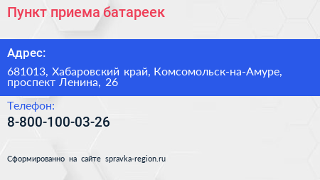 Пункт приема батареек по адресу 681013, Хабаровский край, Комсомольск-на-Амуре, проспект Ленина, 26 в дальнейшем Организация, размещена в следующих категориях: