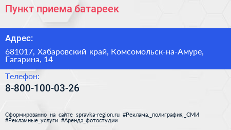Пункт приема батареек по адресу 681017, Хабаровский край, Комсомольск-на-Амуре, Гагарина, 14 в дальнейшем Организация, размещена в следующих категориях: