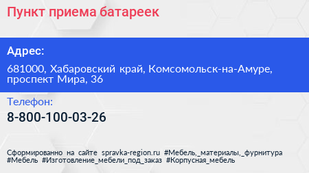 Пункт приема батареек по адресу 681000, Хабаровский край, Комсомольск-на-Амуре, проспект Мира, 36 в дальнейшем Организация, размещена в следующих категориях: