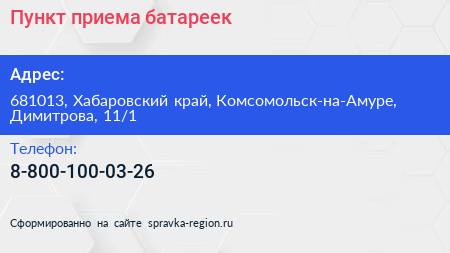 Пункт приема батареек по адресу 681013, Хабаровский край, Комсомольск-на-Амуре, Димитрова, 11/1 в дальнейшем Организация, размещена в следующих категориях: