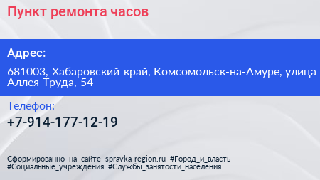 Пункт ремонта часов по адресу 681003, Хабаровский край, Комсомольск-на-Амуре, улица Аллея Труда, 54 в дальнейшем Организация, размещена в следующих категориях: