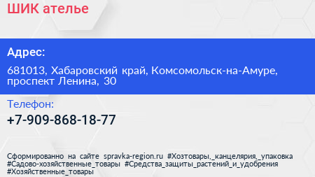 ШИК, ателье по адресу 681013, Хабаровский край, Комсомольск-на-Амуре, проспект Ленина, 30 в дальнейшем Организация, размещена в следующих категориях: