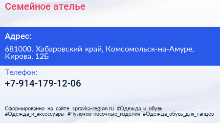 Семейное ателье по адресу 681000, Хабаровский край, Комсомольск-на-Амуре, Кирова, 12Б в дальнейшем Организация, размещена в следующих категориях: