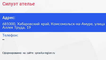 Силуэт, ателье по адресу 681000, Хабаровский край, Комсомольск-на-Амуре, улица Аллея Труда, 19 в дальнейшем Организация, размещена в следующих категориях: