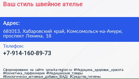 Ваш стиль, швейное ателье по адресу 681013, Хабаровский край, Комсомольск-на-Амуре, проспект Ленина, 18 в дальнейшем Организация, размещена в следующих категориях:
