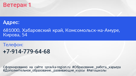 Ветеран 1 по адресу 681000, Хабаровский край, Комсомольск-на-Амуре, Кирова, 54 в дальнейшем Организация, размещена в следующих категориях:
