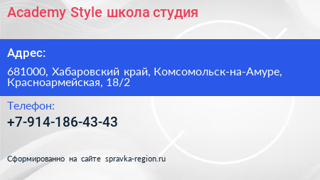 Academy Style, школа-студия по адресу 681000, Хабаровский край, Комсомольск-на-Амуре, Красноармейская, 18/2 в дальнейшем Организация, размещена в следующих категориях: