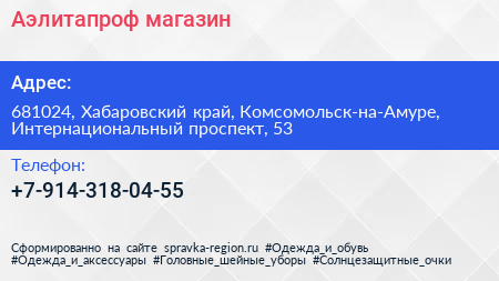 Аэлитапроф, магазин по адресу 681024, Хабаровский край, Комсомольск-на-Амуре, Интернациональный проспект, 53 в дальнейшем Организация, размещена в следующих категориях:
