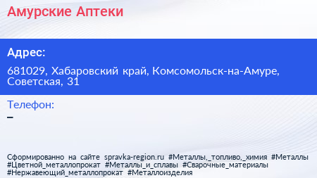 Амурские Аптеки по адресу 681029, Хабаровский край, Комсомольск-на-Амуре, Советская, 31 в дальнейшем Организация, размещена в следующих категориях: