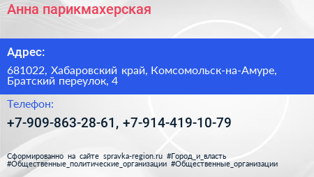 Анна, парикмахерская по адресу 681022, Хабаровский край, Комсомольск-на-Амуре, Братский переулок, 4 в дальнейшем Организация, размещена в следующих категориях: