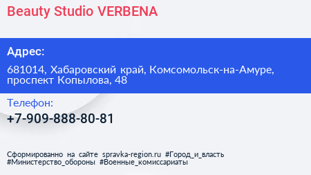Beauty Studio VERBENA по адресу 681014, Хабаровский край, Комсомольск-на-Амуре, проспект Копылова, 48 в дальнейшем Организация, размещена в следующих категориях: