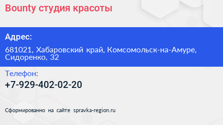 Bounty, студия красоты по адресу 681021, Хабаровский край, Комсомольск-на-Амуре, Сидоренко, 32 в дальнейшем Организация, размещена в следующих категориях: