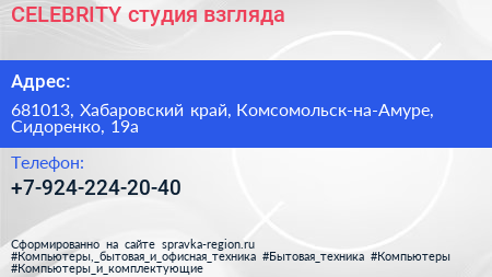 CELEBRITY, студия взгляда по адресу 681013, Хабаровский край, Комсомольск-на-Амуре, Сидоренко, 19а в дальнейшем Организация, размещена в следующих категориях: