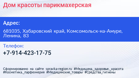 Дом красоты, парикмахерская по адресу 681035, Хабаровский край, Комсомольск-на-Амуре, Ленина, 83 в дальнейшем Организация, размещена в следующих категориях: