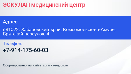 ЭСКУЛАП, медицинский центр по адресу 681022, Хабаровский край, Комсомольск-на-Амуре, Братский переулок, 4 в дальнейшем Организация, размещена в следующих категориях: