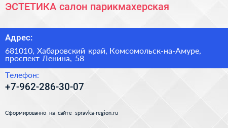 ЭСТЕТИКА, салон-парикмахерская по адресу 681010, Хабаровский край, Комсомольск-на-Амуре, проспект Ленина, 58 в дальнейшем Организация, размещена в следующих категориях:
